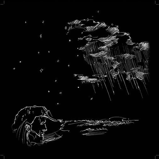 Il a fallu tenter de donner un rythme à ce temps non mesuré, souffler un sablier de verre invisible et fragile pour que chacun des instants s’écoule à sa juste cadence ; mettre le silence en musique pour vous faire entendre au moins le bruit du vent sur cette île… Mettre en forme, agencer, douter, re-créer, effacer, saisir l’accident, le conserver, malaxer l’existant, toujours à partir des traits de Giulia et surtout sans jamais en trahir ni la finesse, ni la délicatesse. Surtout, garder la délicatesse…